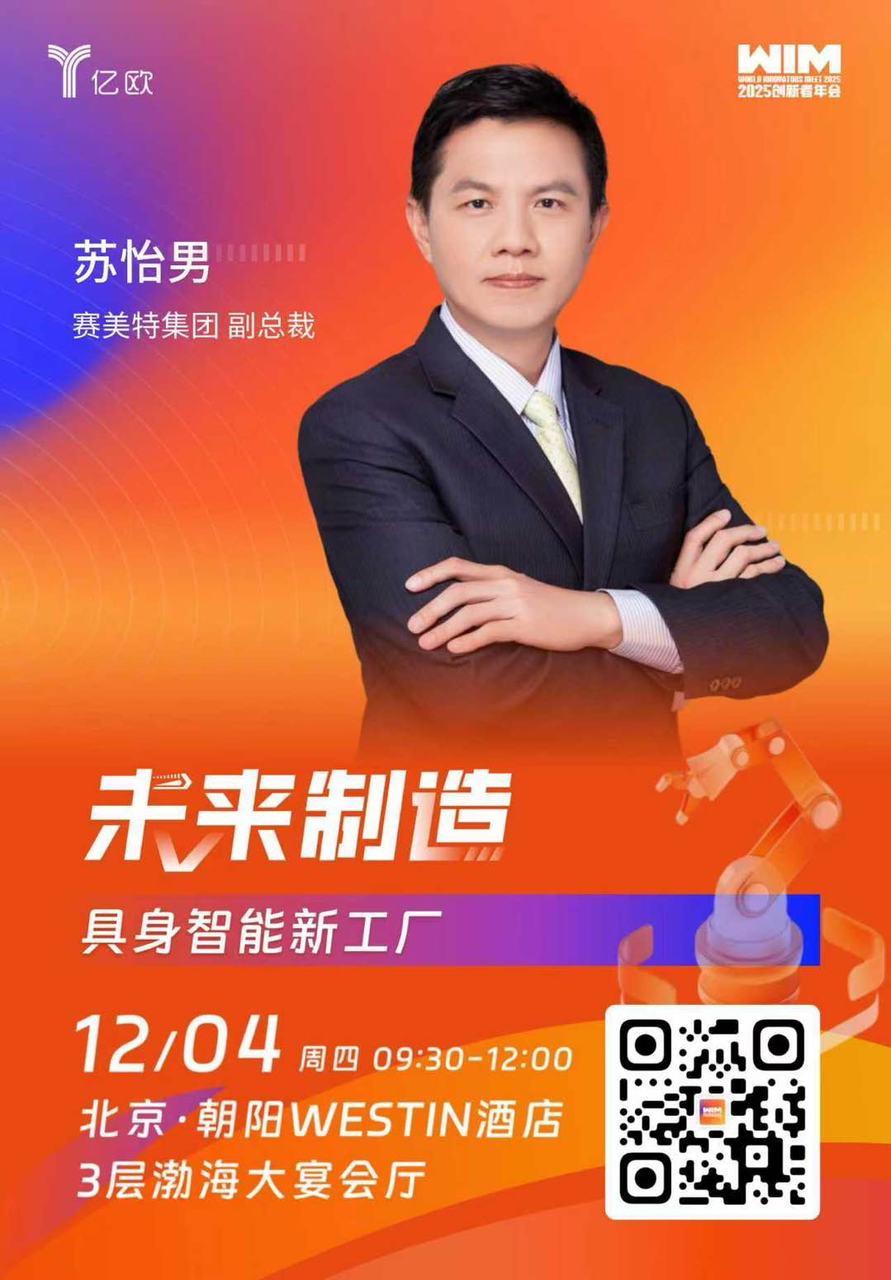 12月4日,赛美特集团副总裁苏怡男先生将出席亿欧WIM2025创新者年会,以24年智能制造实战经验,拆解具身智能新工厂的核心定义与落地路径,解答未来新工厂到底“新”在哪的关键疑问。